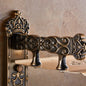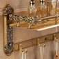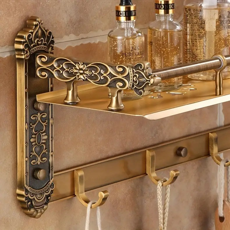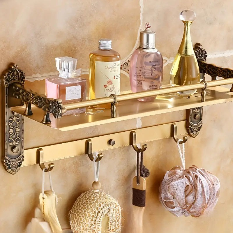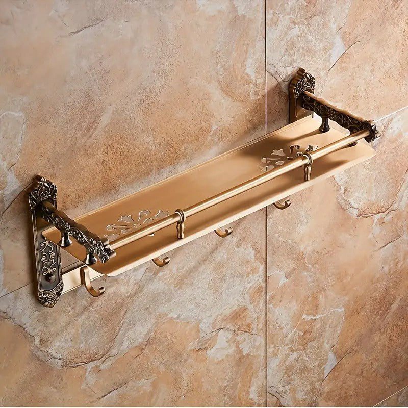 This wall-mounted bathroom shelf features a decorative pattern on its vertical mounting brackets and along the front supports. The main shelf includes a flat upper surface. A rail runs along the front edge of the shelf. Beneath the main shelf, there is a horizontal bar with several hooks.