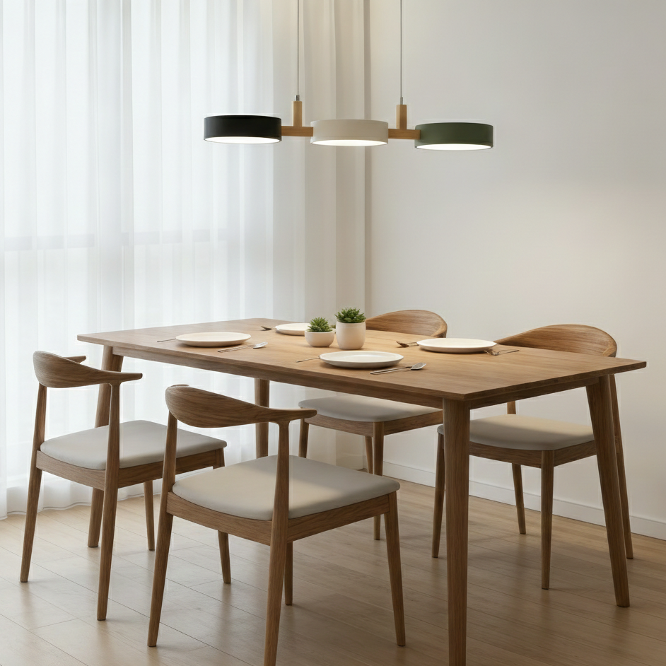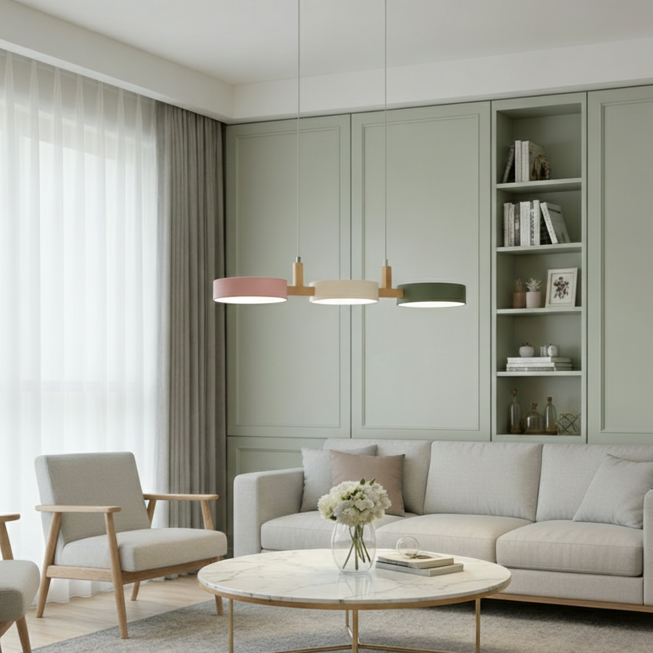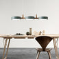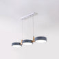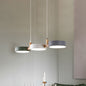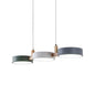 This pendant light features multiple circular shades connected by a horizontal frame with wood accents. The unit is suspended from the ceiling by adjustable cables attached to a rectangular canopy, providing downward illumination. The construction consists of metal housings and wood components, with integrated LED light sources protected by flat diffusers for uniform light distribution.