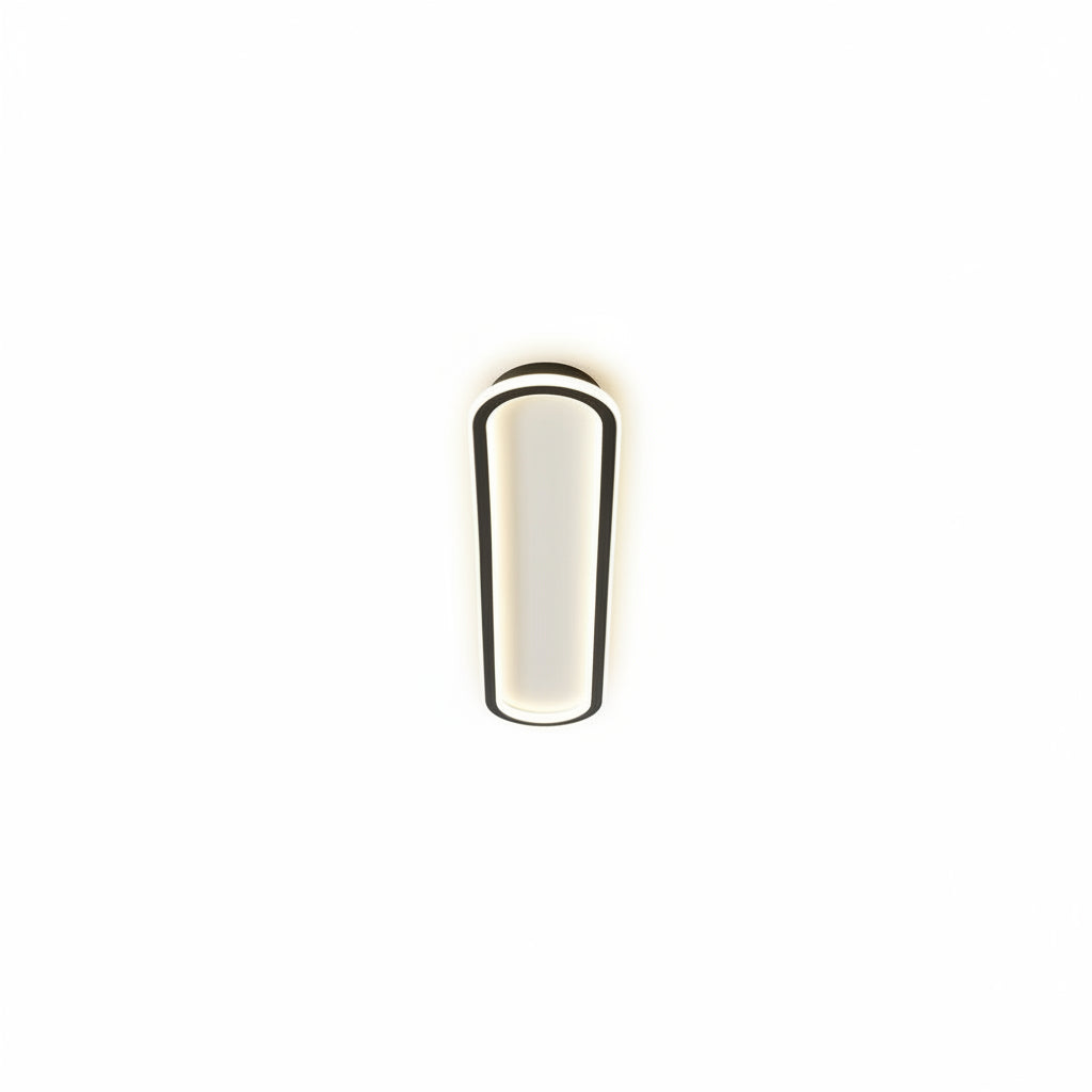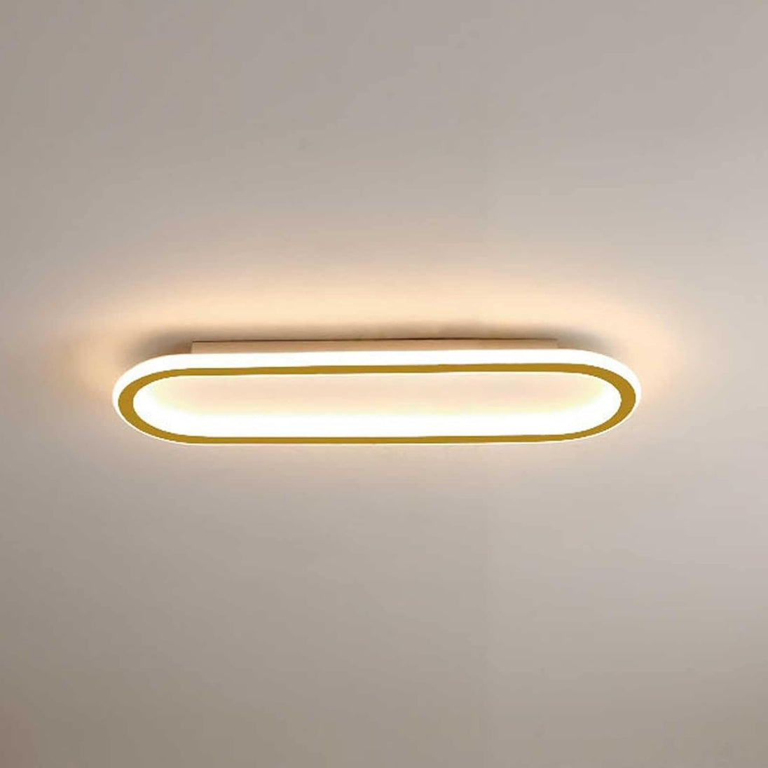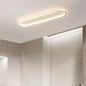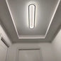 This low-profile ceiling-mounted fixture features a linear, elongated body with rounded ends and a matte finish. The unit is designed for fixed overhead installation and features a slim geometric profile. The construction consists of a fixed mounting base and a single-piece translucent diffuser designed to provide uniform light distribution across the length of the housing.