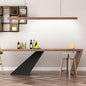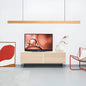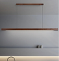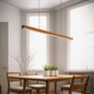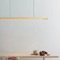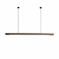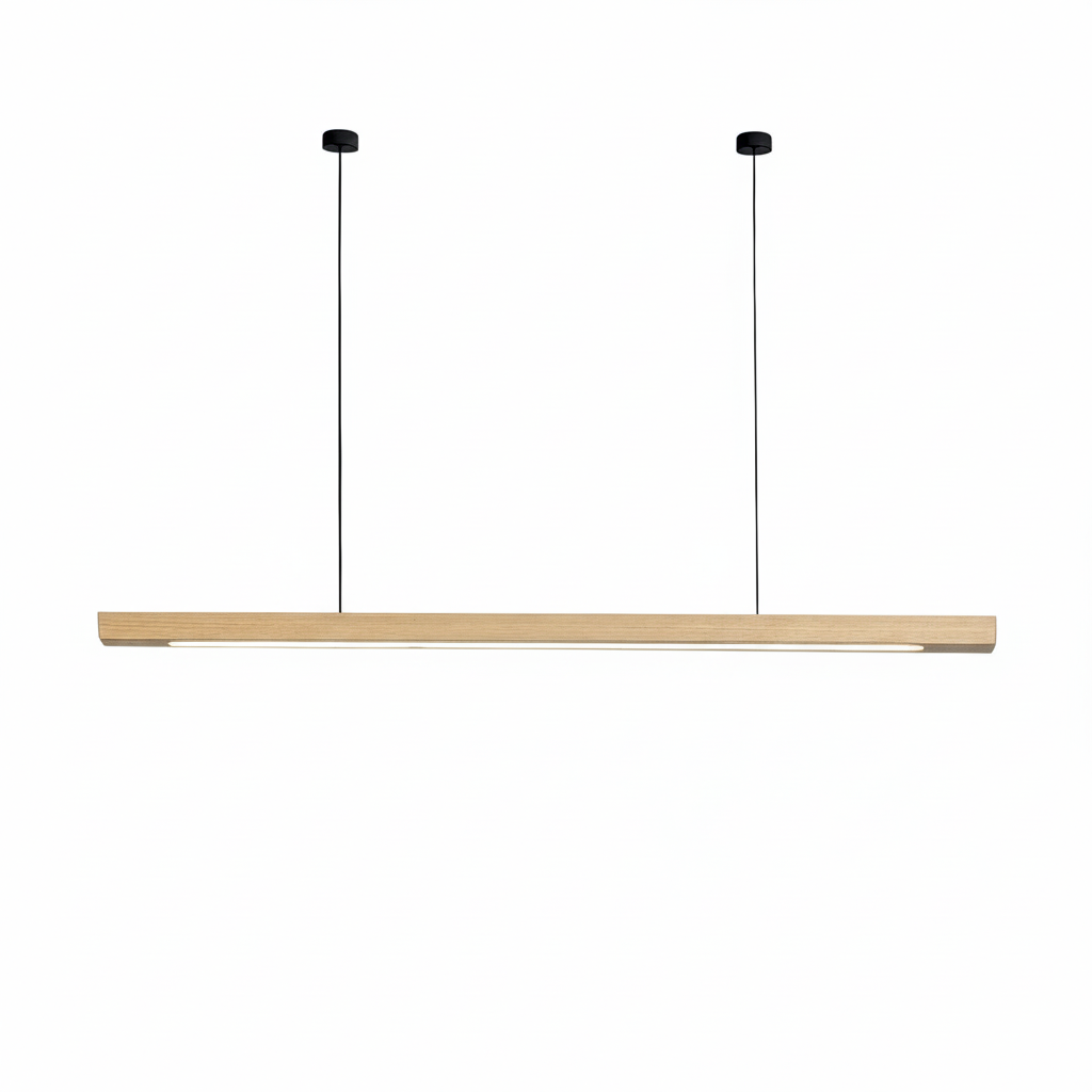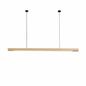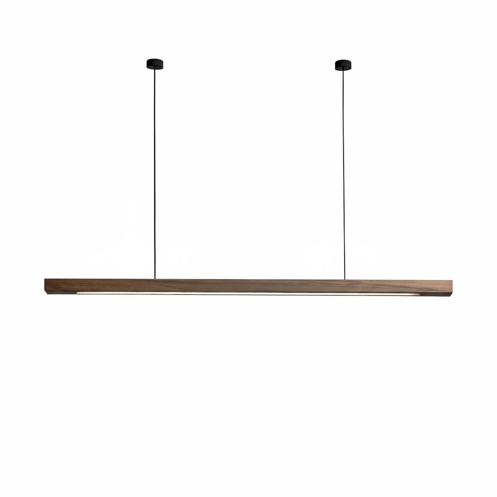 This pendant light features a linear, rectangular beam design constructed from wood. The fixture includes an integrated light source running along the underside of the beam and is suspended by twee thin cables. It is designed for hardwired ceiling installation.