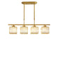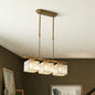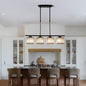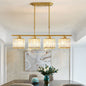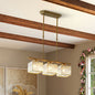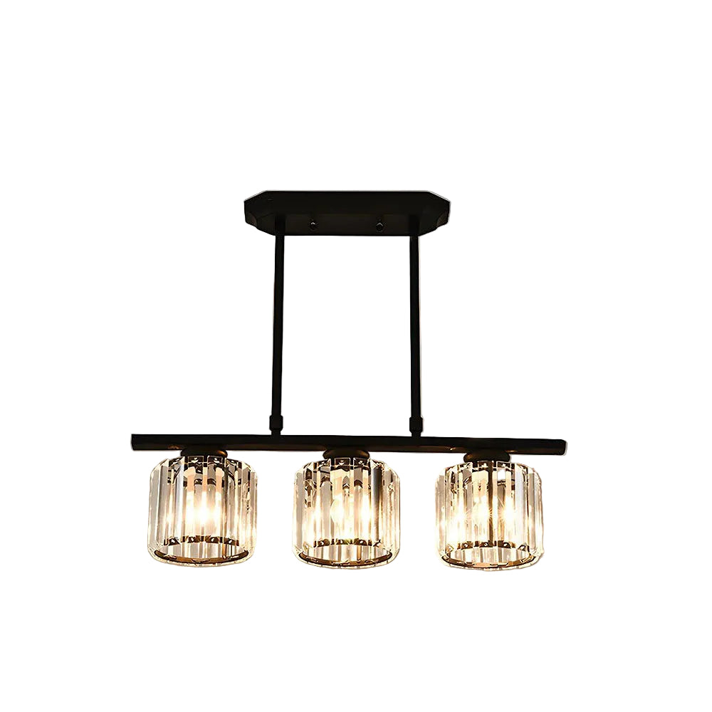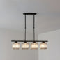 This ceiling-mounted fixture features a horizontal linear frame supporting multiple individual shades composed of vertically aligned transparent rods. The unit is designed for pendant installation with a rectangular ceiling canopy and dual support rods. The transparent elements surround individual lamp bases to provide distributed illumination.