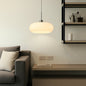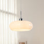 This pendant light features a round, opaque glass shade. The shade is suspended from a hanging cable attached to a ceiling mount. The fixture is a hardwired ceiling installation. The upper section of the shade includes a metal component connecting the glass to the suspension cable.
