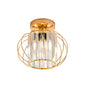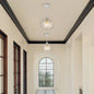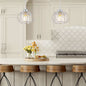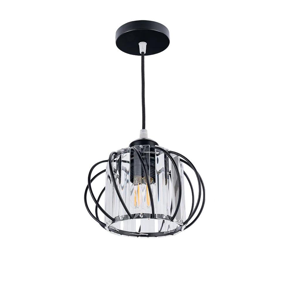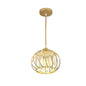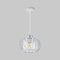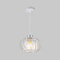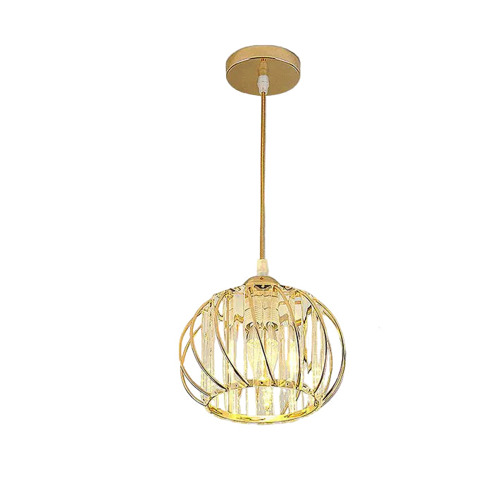 This interior pendant light fixture features a central spherical glass shade encased within a geometric wire frame cage. The unit is suspended from a circular ceiling canopy by a single adjustable cable. The fixture utilizes the glass and wire structure to provide multi-directional illumination across interior surfaces. The unit features a fixed mounting assembly designed for overhead installation.