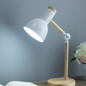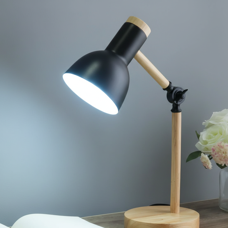 This table lamp features a durable construction combining a painted iron shade with a natural wooden arm and base. The unit is designed with a flexible arm and shade, allowing for precise directional lighting to suit various interior needs. The integration of mixed materials provides a balanced aesthetic that delivers functional and efficient illumination.