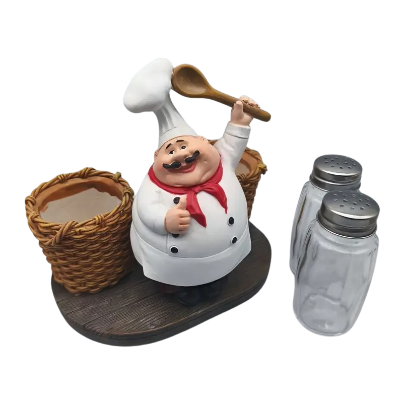 • Style: Chef figurine with cylindrical containers for holding kitchen shakers.
