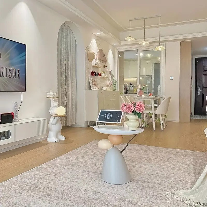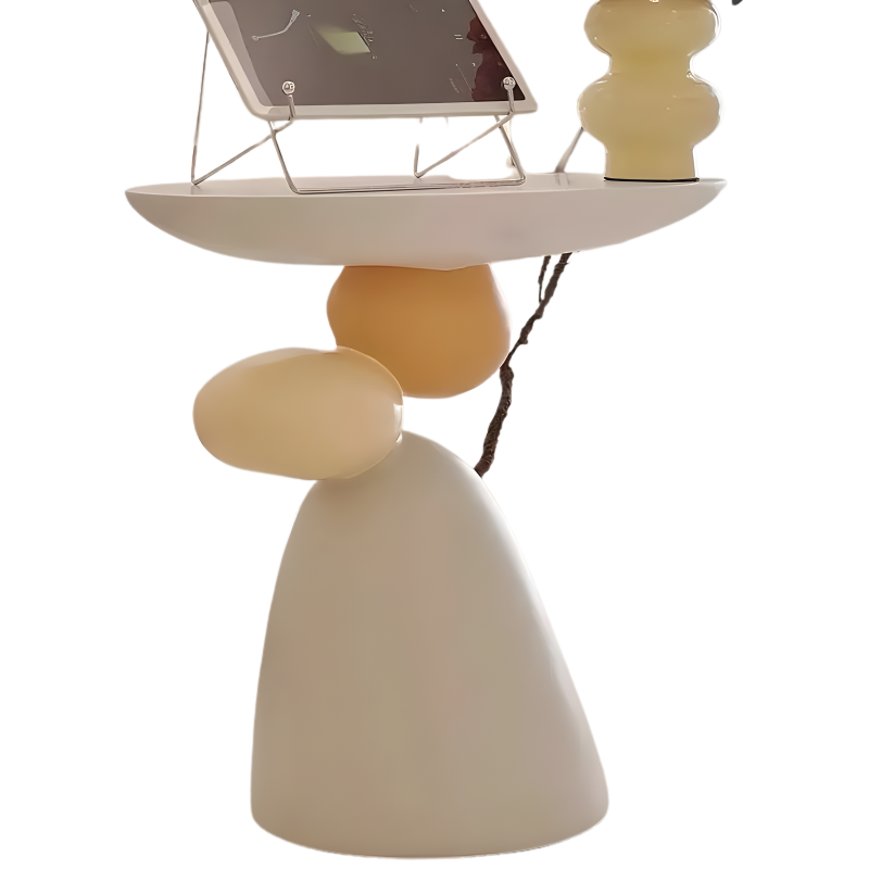 • Shape: Features a flat, circular tabletop supported by stacked, rounded shapes and a tapered dome base.