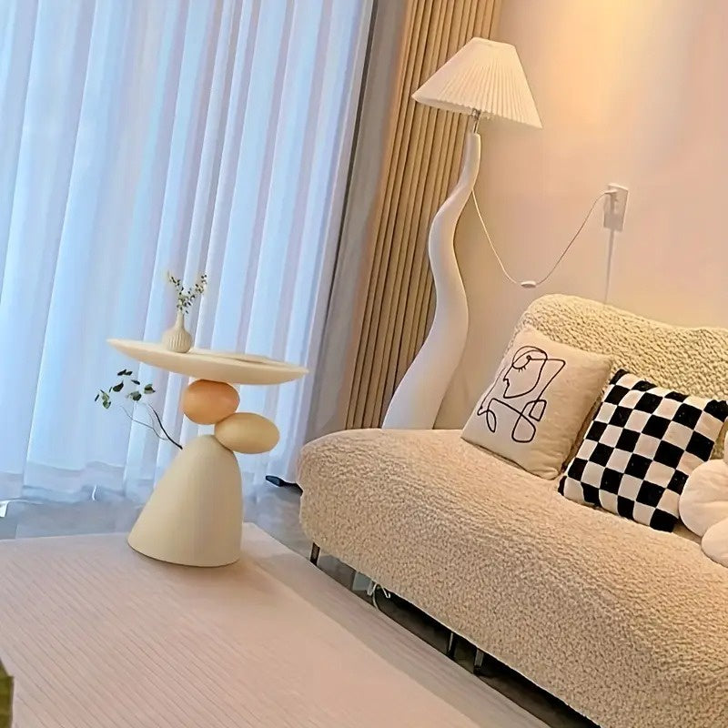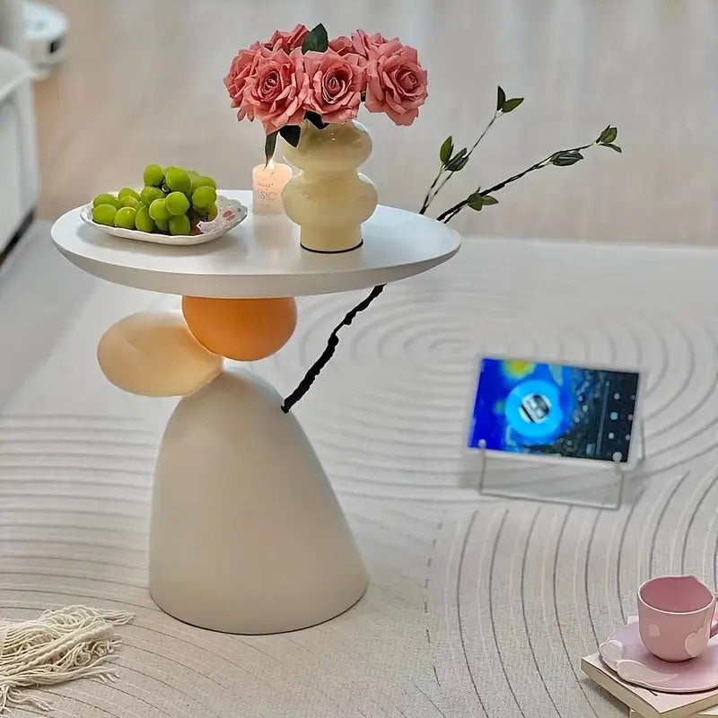This side table features an abstract style composed of geometric forms. The table begins with a flat, circular tabletop. The base takes the form of a tapered dome. Above the dome, two smaller rounded shapes are stacked vertically, forming a transition between the base and tabletop.