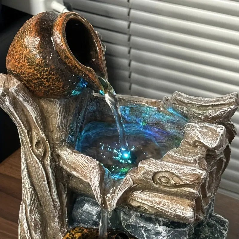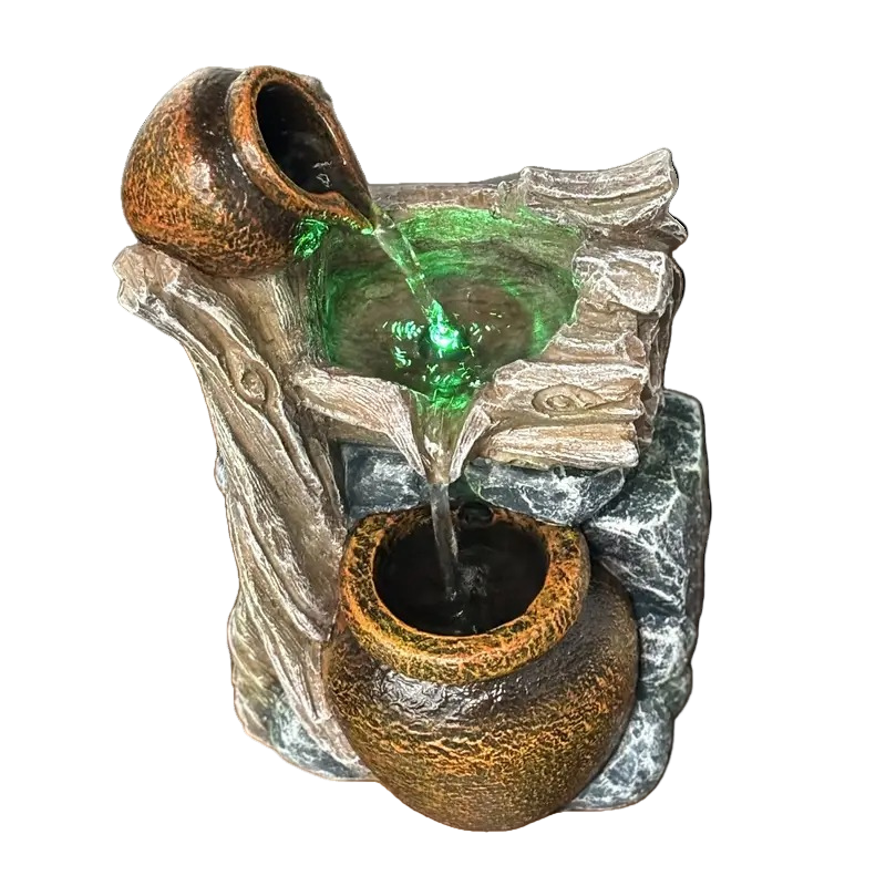The water fountain is made to resemble natural elements. Water flows from an upper pot into a middle basin before cascading into a larger lower pot. A built-in light element is positioned in the center, illuminating the water.