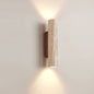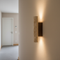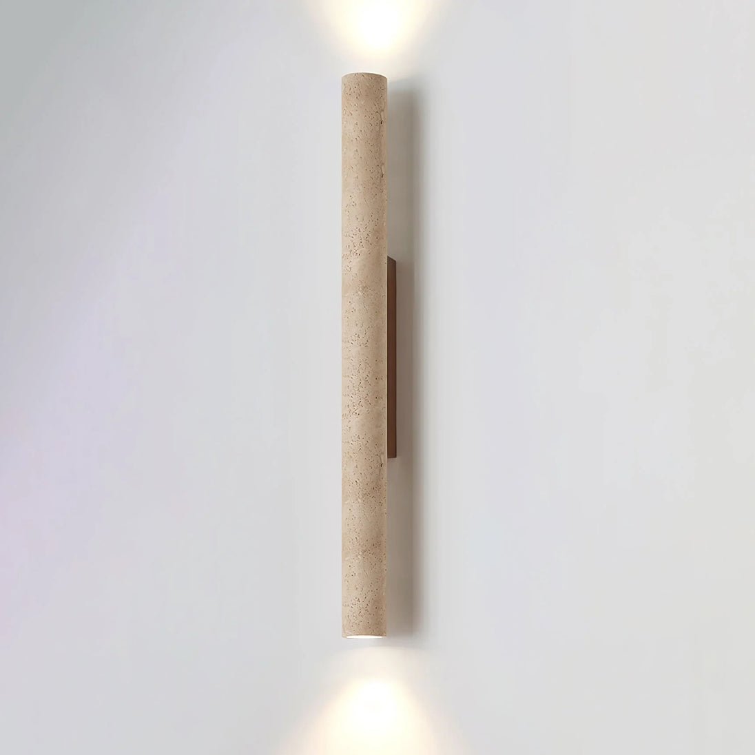 This wall-mounted light fixture is hand-carved from solid travertine stone, featuring unique natural veining and a textured finish. Designed with a clean cylindrical silhouette, the unit provides dual-directional up-and-down illumination to enhance architectural depth within interior spaces. The construction combines authentic stone with metal and wood components to deliver a balanced, sculptural aesthetic and functional lighting.