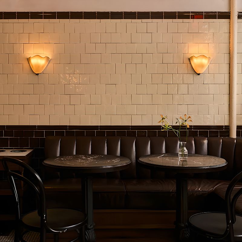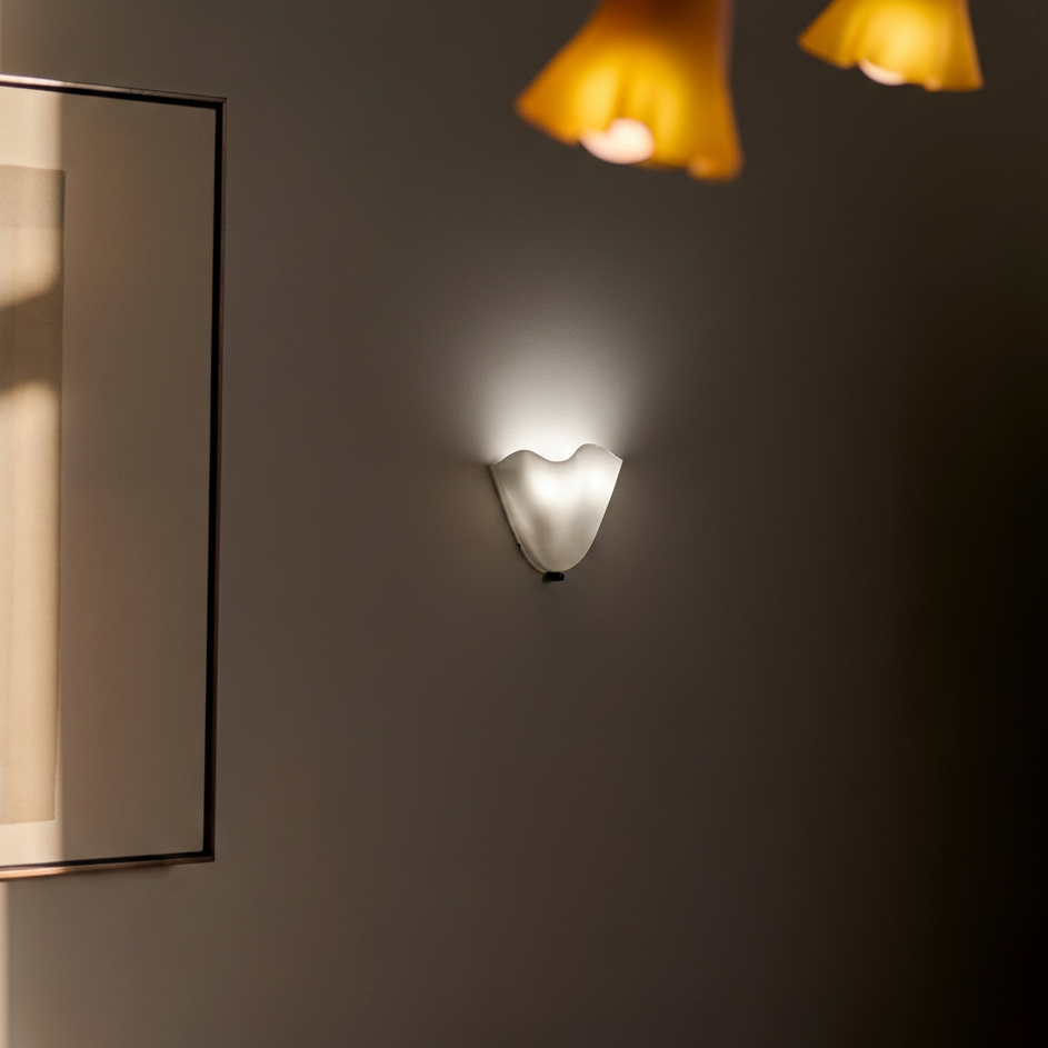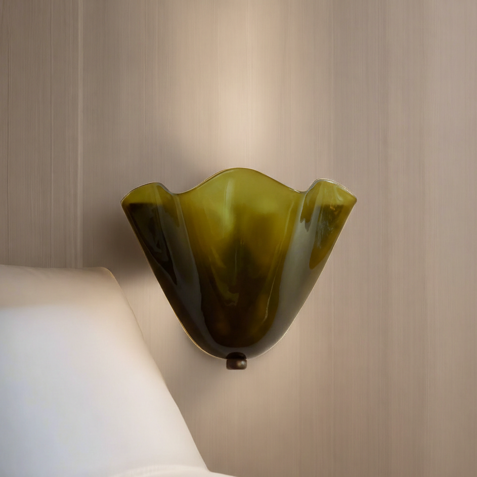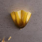 This wall-mounted light fixture features a handcrafted lampshade constructed from glass in a skirt shell silhouette. The unit is designed for a fixed, hardwired installation against vertical surfaces to provide localized ambient illumination. The construction includes an iron body and an E14 base compatible with LED light sources, allowing for diffused light distribution through the glass panels.