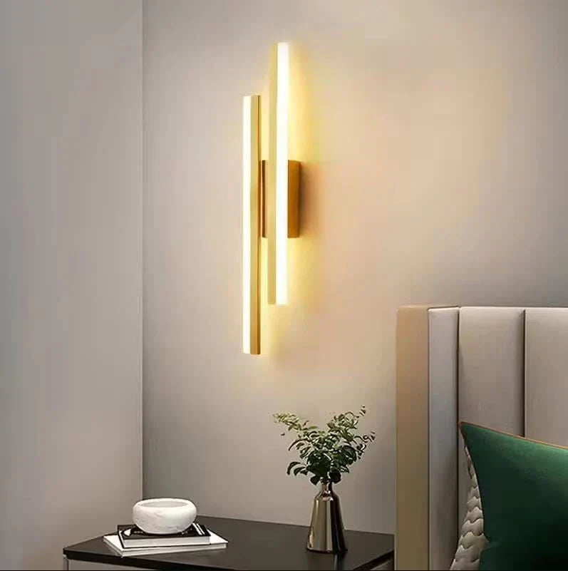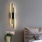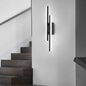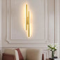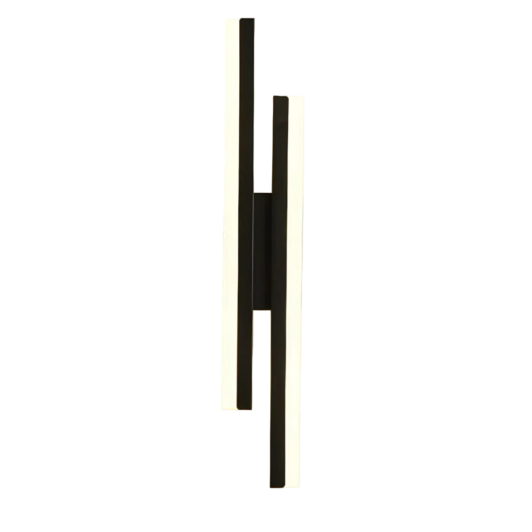 This wall-mounted light fixture features a slender, multi-layered rectangular frame constructed from iron and acrylic. The unit is designed for a fixed installation against vertical surfaces, utilizing integrated LED light sources to provide ambient illumination. Its linear construction consists of overlapping vertical elements that distribute light through translucent acrylic diffusers.