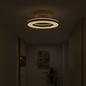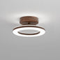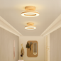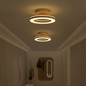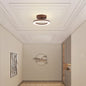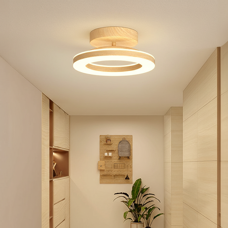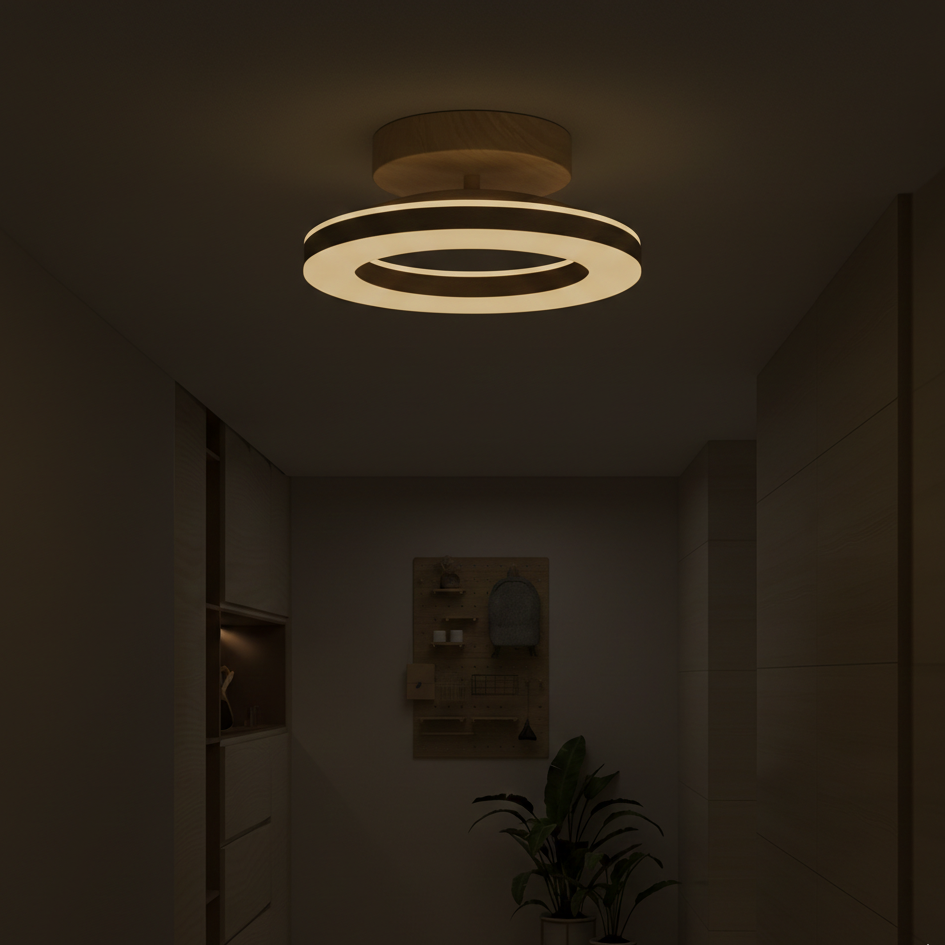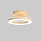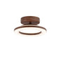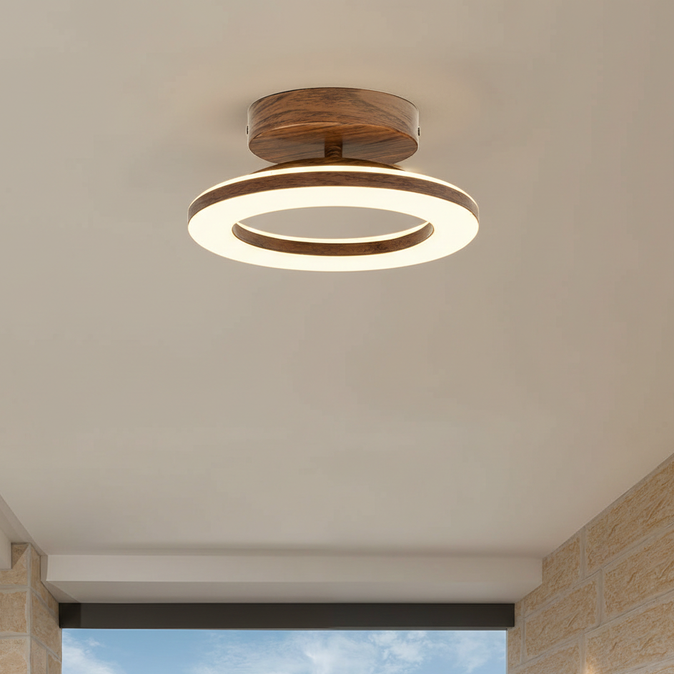 This ceiling light features a circular acrylic shade supported by an iron frame with wood-textured accents. The fixture is designed for a fixed installation directly against flat ceiling surfaces. It includes an integrated LED light source that provides illumination through a translucent ring-shaped diffuser.